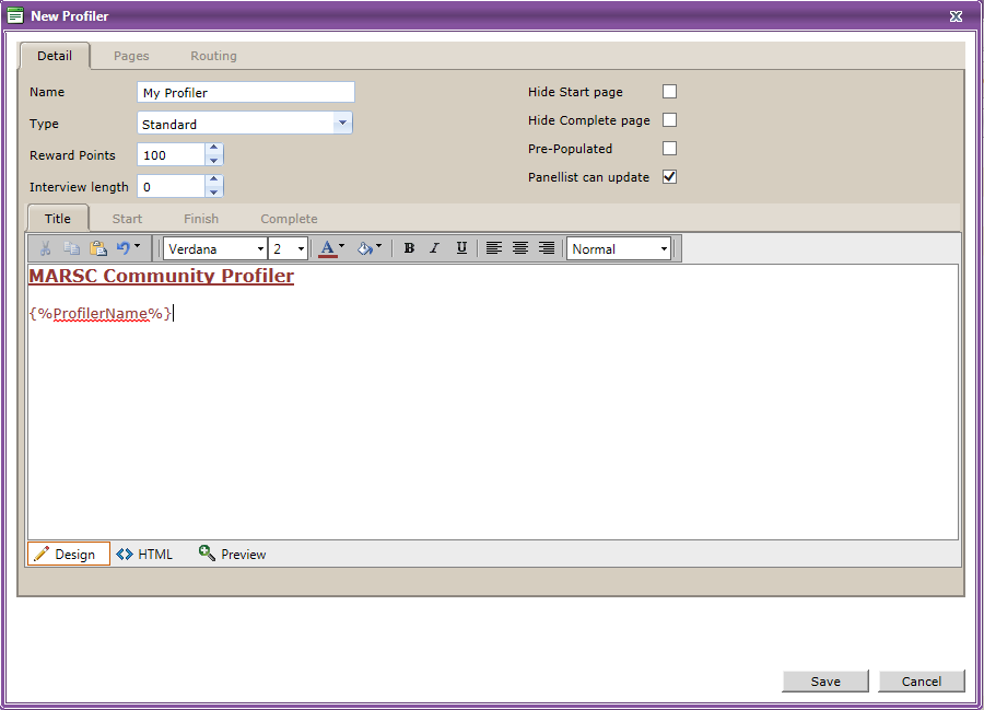 | Detail | Basic items about the profiler such as name, type of profiler and the number of reward points; the user can also format notes to be displayed on the pre-defined pages of the profiler. |