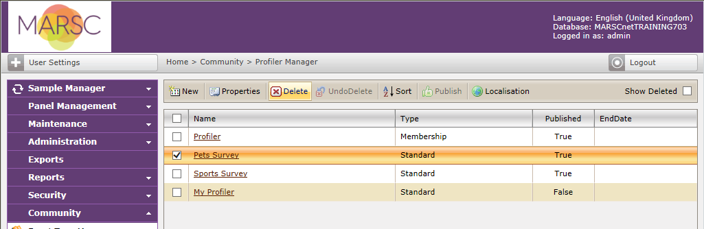 The list shows the profiler name and type, and a published flag which will display True or False. Only published profilers will be displayed on the Q_Community website. Currently End Date is not used in the system, so this will remain blank.
